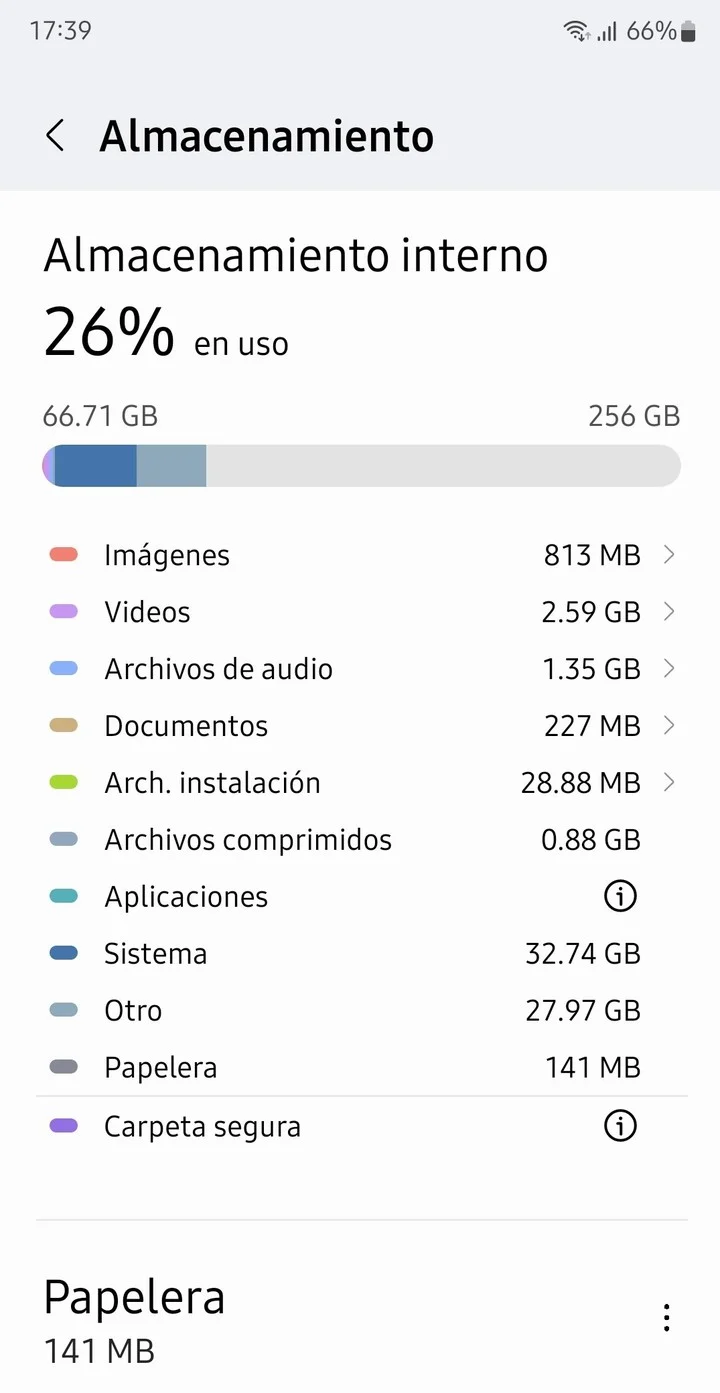 El pasaje más directo es ir a Ajustes y de allí, hasta Almacenamiento. Al pulsar sobre la tabla que muestra los niveles de ocupación, se desglosa los porcentajes que ocupan fotos, audio, documentos, aplicaciones, videos y sistema. Y a partir de estos valores, proceder a su depuración.