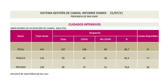 Además, se encuentran internados 223 pacientes en las áreas de COVID-19 (entre positivos y sospechosos) de los hospitales Dr. Guillermo Rawson; Dr. Marcial Quiroga; Dr. Ventura Lloveras, de Sarmiento; Dr. César Aguilar, de Caucete; Dr. José Giordano, de Albardón; Dr. Federico Cantoni, de Pocito; CEMEC; Dra. Julieta Lanteri; Hospital San Roque, de Jáchal; Hospital Dr. Alejandro Albarracín, de Valle Fértil; Hospital de Barreal, de Calingasta; Hospital Privado; Instituto Médico; Clínica El Castaño; Clínica Santa Clara; Sanatorio San Juan y CCI.