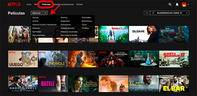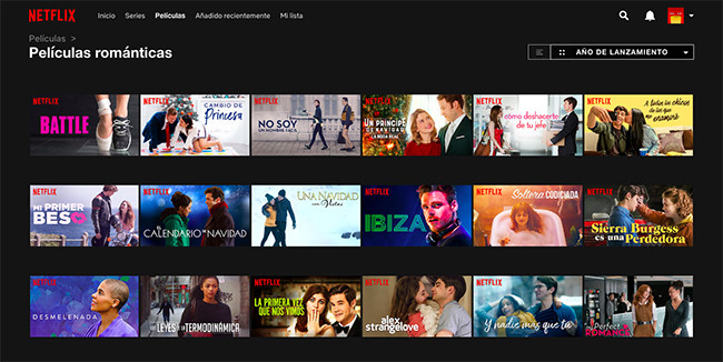 Ahora existe una manera de elegir el orden de las películas o series. Desde la pantalla de inicio marca arriba qué deseas ver, en este caso hemos elegido películas. Ahora selecciona el género que quieres ver, por ejemplo, en este caso, románticas.