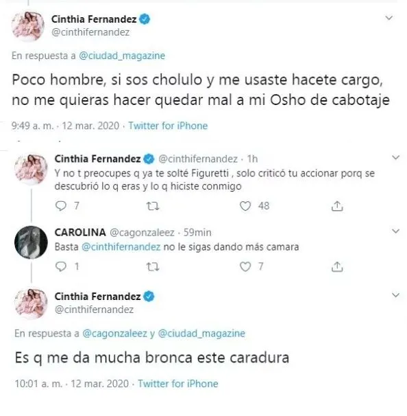 Por lo que Cinthia sostuvo: "Yo tampoco quiero estar con él, me da asco. No te preocupes". Además, otro usuario le sugirió que dejara de "darle cámara" y al respecto, la artista sentenció: "Es que me da mucha bronca este caradura".