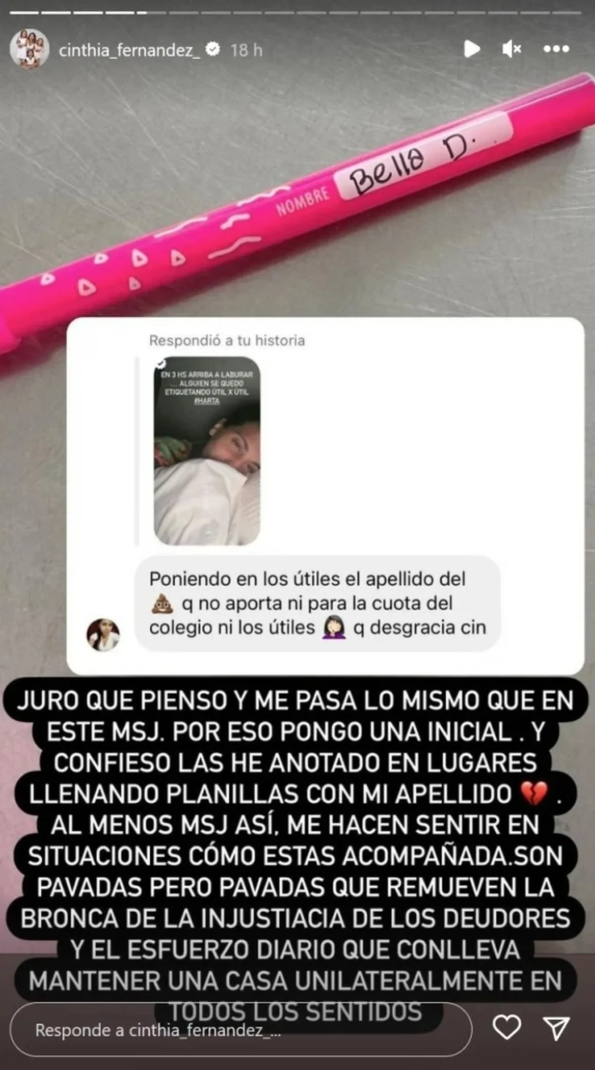 "Poniendo en los útiles el apellido del padre que no aporta ni para la cuota del colegio ni los útiles, qué desgracia", le comentaron en la imagen a Cinthia.
