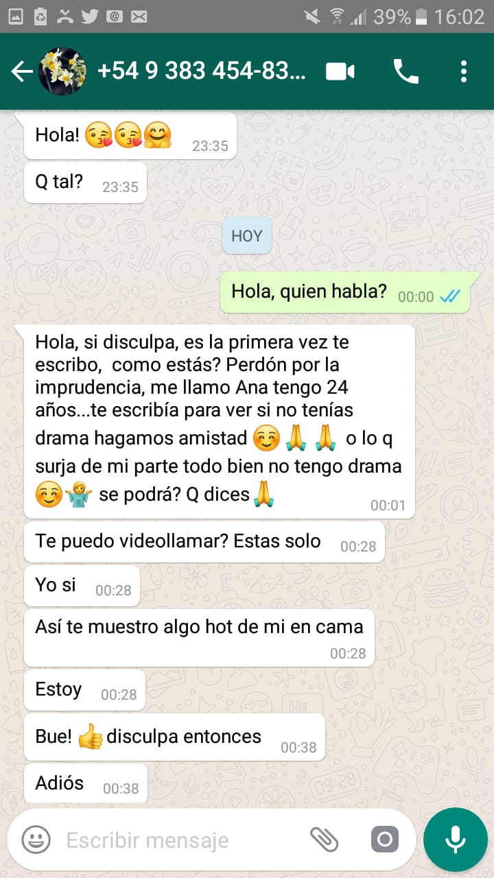 Es probable que la tal "Ana" ni siquiera sea de este país, ya que utiliza algunas palabras en un castellano neutro. Pero sigue: "Estoy en camita sola así te muestro algo hot de mi", afirma y pide realizar una videollamada. Si no hay respuesta por parte del destinatario, luego de unos momentos pide perdón.