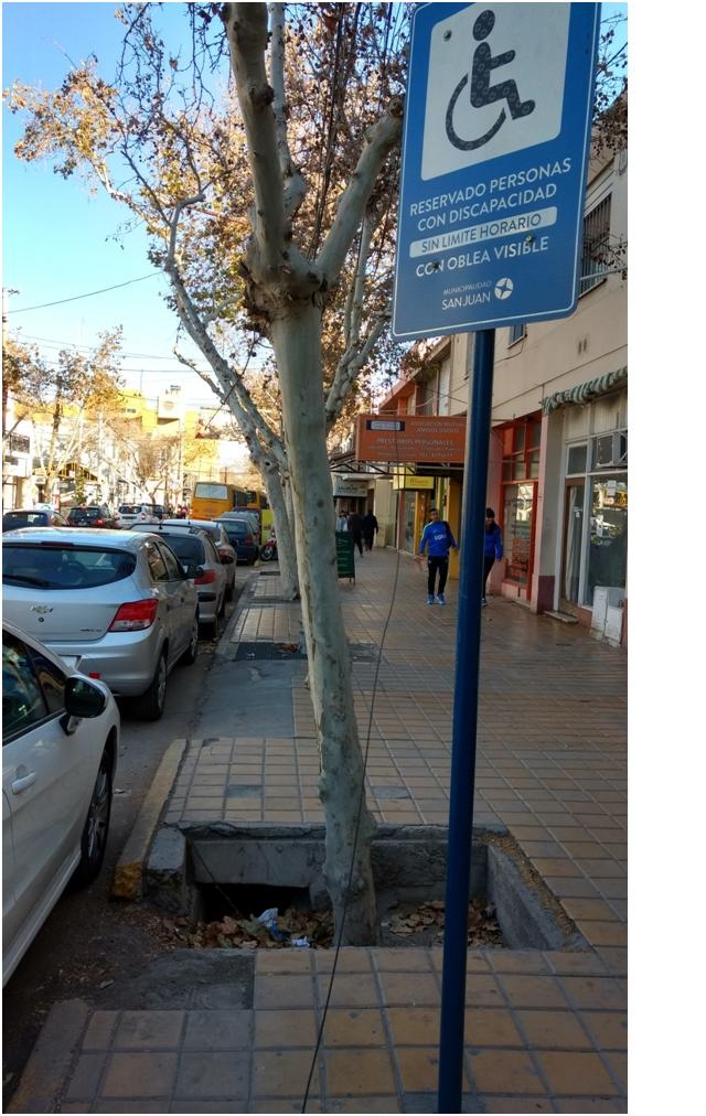 Un solo ejemplo muestra la gravedad del problema. Sobre calle Mendoza antes de Gral. Paz, hay un solo estacionamiento para discapacitados. Allí se puede observar el escaso espacio demarcado para estacionar (sólo cabe un Fiat 600) con riesgo de multa si el vehículo es de mayor longitud. Existe un tremendo pozo por la falta de tapa de la acequia que está llena de mugre justo donde debe descender el discapacitado, y por si esto fuera poco, un cable cortado que pende de un poste, llega hasta el fondo de esta verdadera trampa especializada en minusválidos.