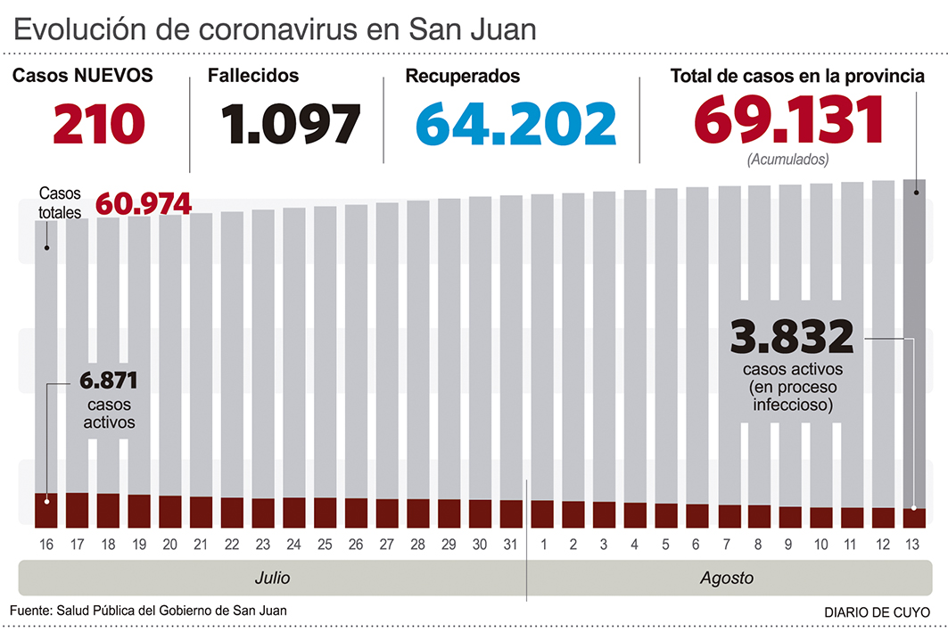 Salud Pública informó ayer el deceso por covid de dos personas. Se trata de mujeres, de 71 y 58 años, por lo que el total de fallecidos ahora es de 1.097 sanjuaninos. A su vez, detectaron 210 casos y el acumulado asciende a 69.131 infectados. De ellos, hay 3.832 casos activos y 157 internados, de los cuales 93 permanecen en terapia intensiva (hay 34 con respirador artificial).