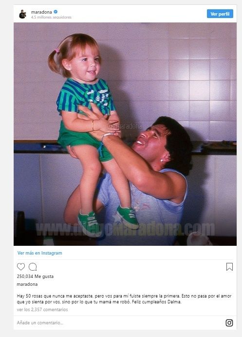 Hace unos días, Diego Maradona le dedicó un mensaje a su hija mayor, Dalma, por su cumpleaños. Sin embargo, pese a las tiernas palabras, no omitió un comentario en contra de su ex pareja, Claudia Villafañe.