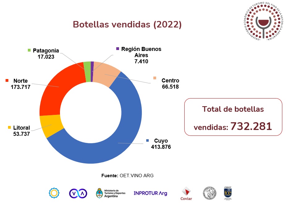 Según relevamiento vía encuestas de los propios establecimientos abiertos al turismo, en todo el 2022 se registraron 1.264.004 visitas a bodegas. Ese total de visitas generó, según informaron las propias bodegas, un total de 732.281 botellas de vino vendidas. Esto da como relación que de cada 1,72 visitas a bodegas, se vende una botella de vino.