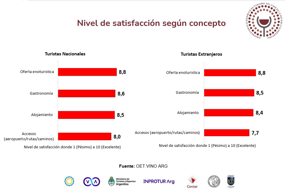 El nivel de satisfacción por parte de los turistas del vino en Argentina es alto. Y esta valoración positiva es compartida tanto por los visitantes nacionales como los extranjeros que recorren las bodegas abiertas al turismo en Argentina. La oferta enoturística en general es calificada en promedio con un puntaje de 8,8 sobre 10. Y la gastronomía en bodega es valorada con 8,6 por los argentinos y con 8,5 sobre 10 por los extranjeros, según las opiniones relevadas por el Observatorio Económico del Turismo del Vino.