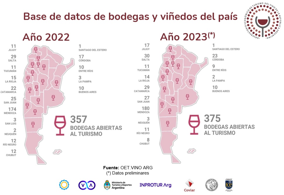 Al cierre de 2022, en la Argentina fueron relevados 357 bodegas abiertas al turismo en 16 provincias. Según datos preliminares a abril de 2023, el total de bodegas abiertas al turismo subió a 375.