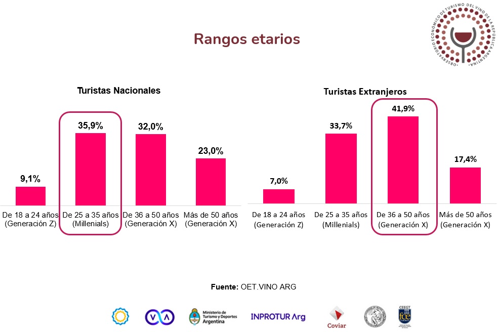 Entre los turistas del vino argentinos, el 35,9% de los visitantes tienen de 25 a 35 años. Si se tiene en cuenta que el 9,1% de los visitantes totales tienen entre 18 y 24 años, el 45% del total de los argentinos que van a bodegas a nivel país son menores de 35 años.