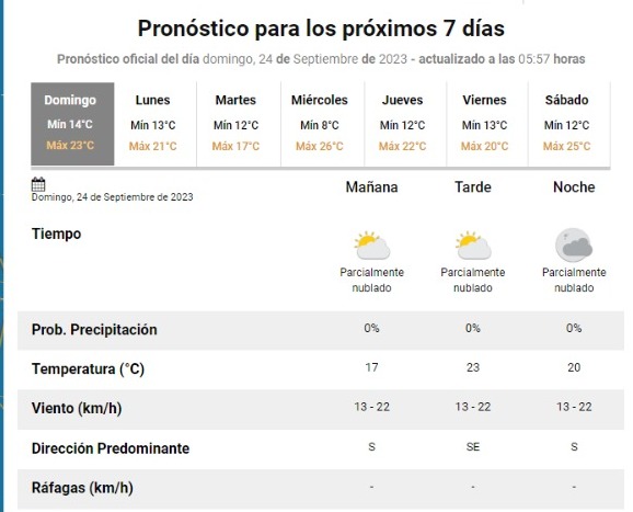 La temperatura máxima rondará los 23 grados con viento leve del sector Sur. Las nubes coparán el cielo por lo que no se espera una jornada soleada, sino de cielo parcialmente nublado.