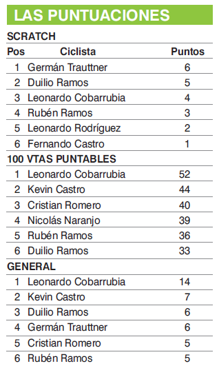 Luego de un momento de calma chicha en el grupo, un cuarteto saltó para sacar ventaja: el mayor de los hermanos Ramos, Cobarrubia y los dos Castro (Kevin y Fernando). Los más pibes consiguieron conectar al grupo y consiguieron otros veinte puntos para asegurarse el primero y segundo lugar en las puntuables. Quedaban tres embalajes, pero el trabajo combinado de los dos equipos municipales sureños hacía estériles cualquier intento de acercarse de parte de Naranjo y los demás competidores.
