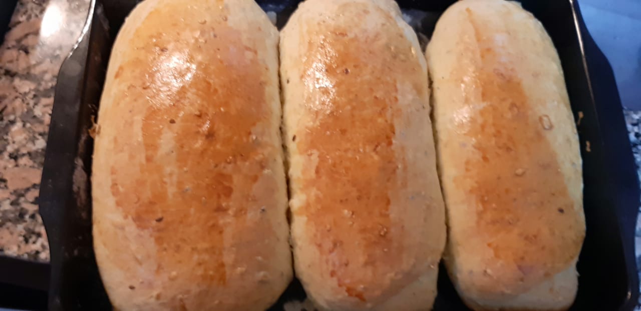 Transcurrido ese tiempo dividir la masa en dos y desgasificar (retirarle el gas que posee la masa) formar un rectángulo de cada masa y enrollar. Colocar en una budinera o si no tienen en una placa ambos panes. Volver a tapar y dejar que duplique su volumen. Una vez listo hornear en horno precalentado a 200 grados C por 40 minutos.