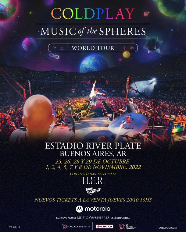 Coldplay ofrecerá conciertos en Argentina los días 25, 26, 28 y 29 de octubre y el 1, 2, 4, 5, 7 y 8 de noviembre, en lo que será un récord histórico para un artista en ese escenario, al superar las nueve fechas ofrecidas por Roger Waters en 2012.