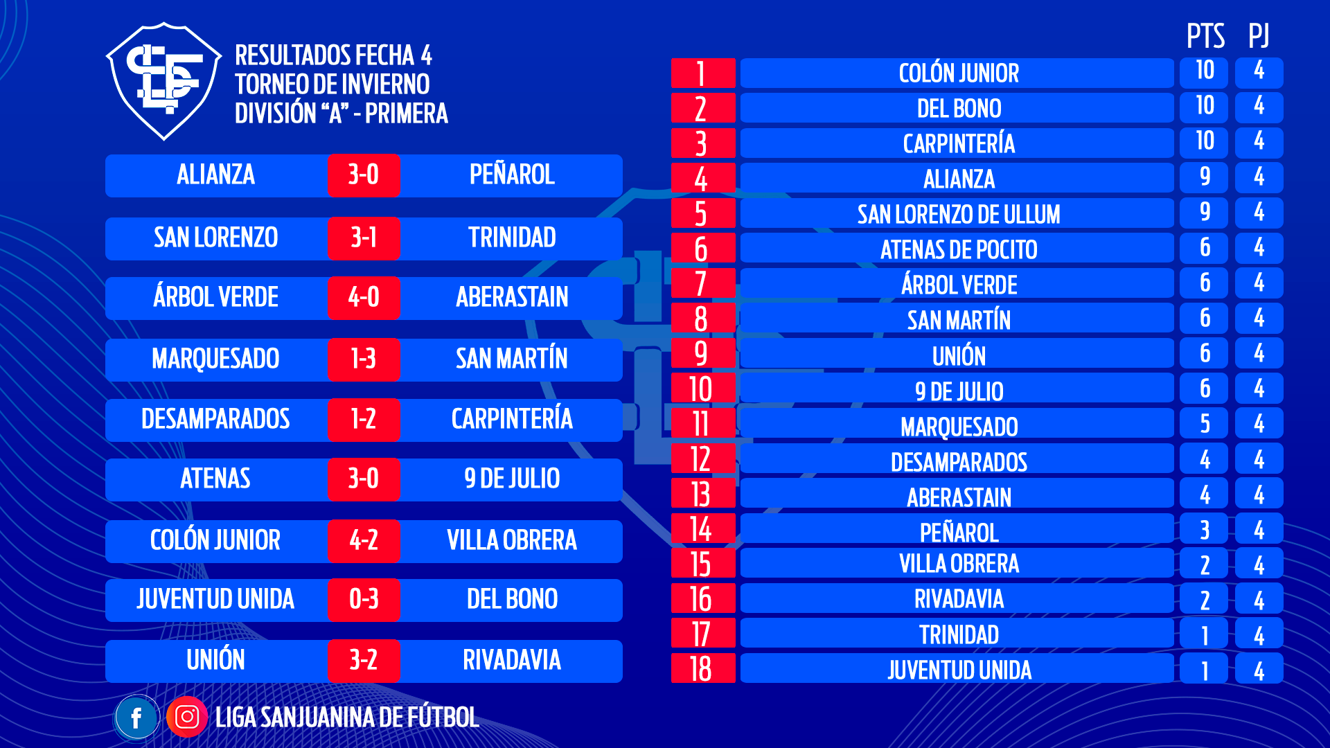 En la tarde de este domingo se cerró la cuarta fecha del Torneo de Invierno con triunfos de Colón y Del Bono, que junto a Carpintería, mandan en las posiciones del fútbol doméstico.