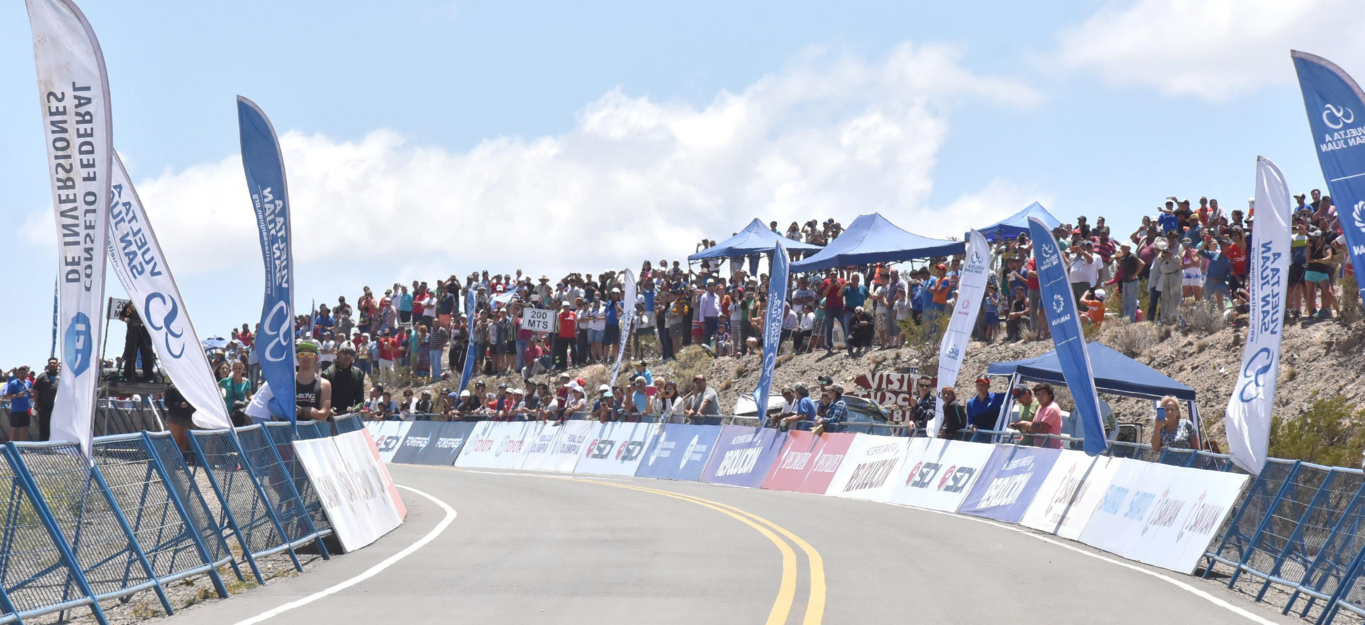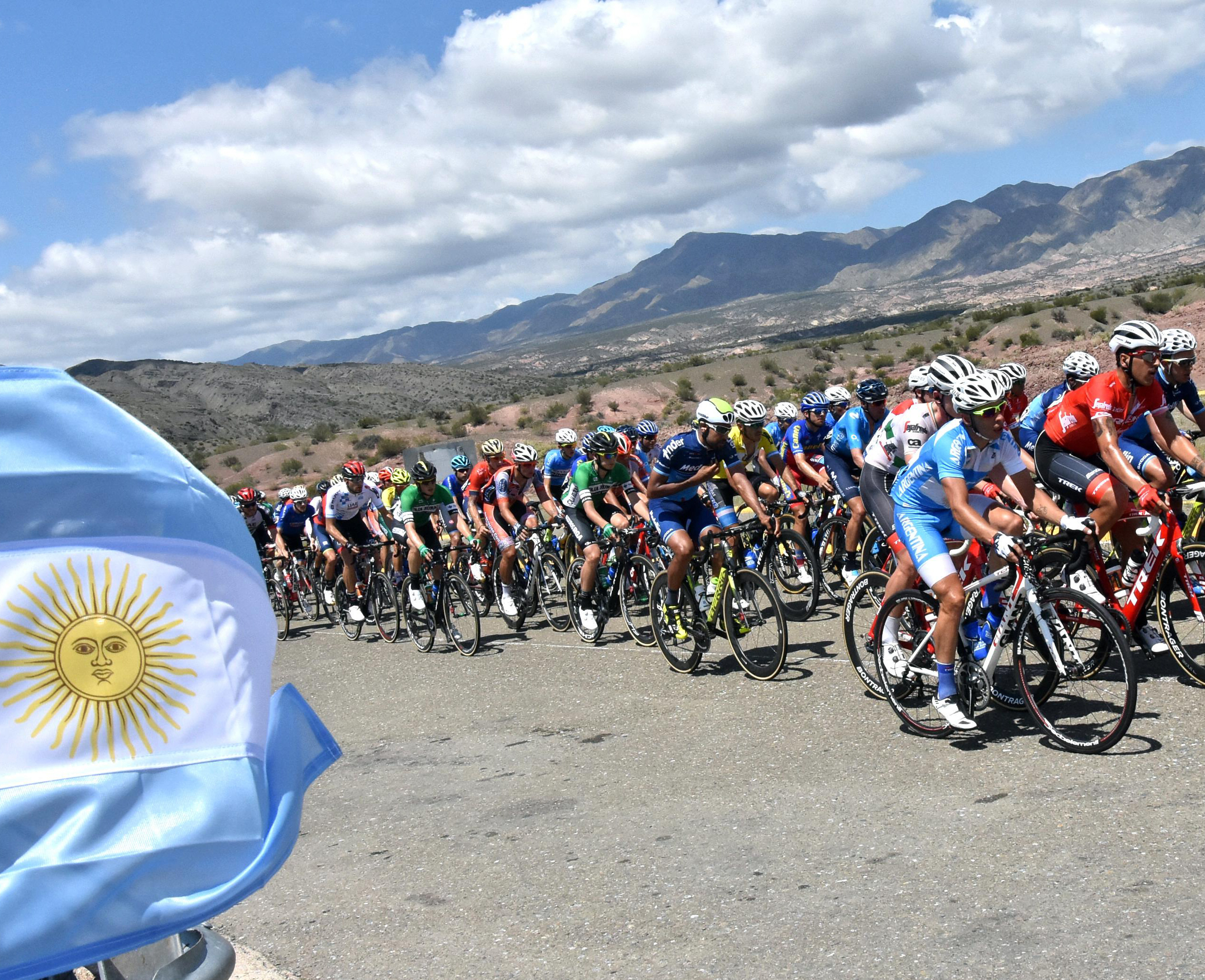 Bien patrio. Una bandera argentina en pleno ascenso al Colorado ornamenta el paso del pelotón. La etapa tuvo victoria argentina al final con Najar.