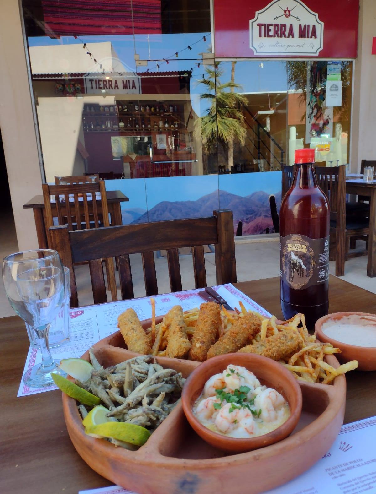 "Lo que servimos podría definirse como comida patriótica, bien argentina. Podes encontrar un guiso de lentejas con panceta, chorizo tipo español hasta platos de carne como entraña, bondiola Puerto Argentino, solomillo del Coronel Barcala acompañado de algún ingrediente típico como es la ensalada de mote (que es un maíz que se come mucho en el norte) y postres como el Patos Sur que es un panqueque con harina de maíz morado, crema helada y bañado en chocolate con merenguitos, haciendo referencia al paso cordillerano por el cuál San Martín con el ejército libertador cruzó a Chile. Trabajamos con productos del Norte y fundamentalmente de San Juan, no sólo frutas y verduras o cortes de carne, sino especialmente vinos y aceites de olivas que son de altísima calidad. Por eso es Tierra Mía. Es lo que cualquiera ha podido disfrutar en su casa, bien calórico, super rico", define Gabriela Valdiviezo quien no sólo es la encargada del local, sino también su principal chef, la que sazona como aprendió en su casa y quien pone todos los detalles a cada plato. No está sola. Tiene un equipo de cocina que la acompaña.