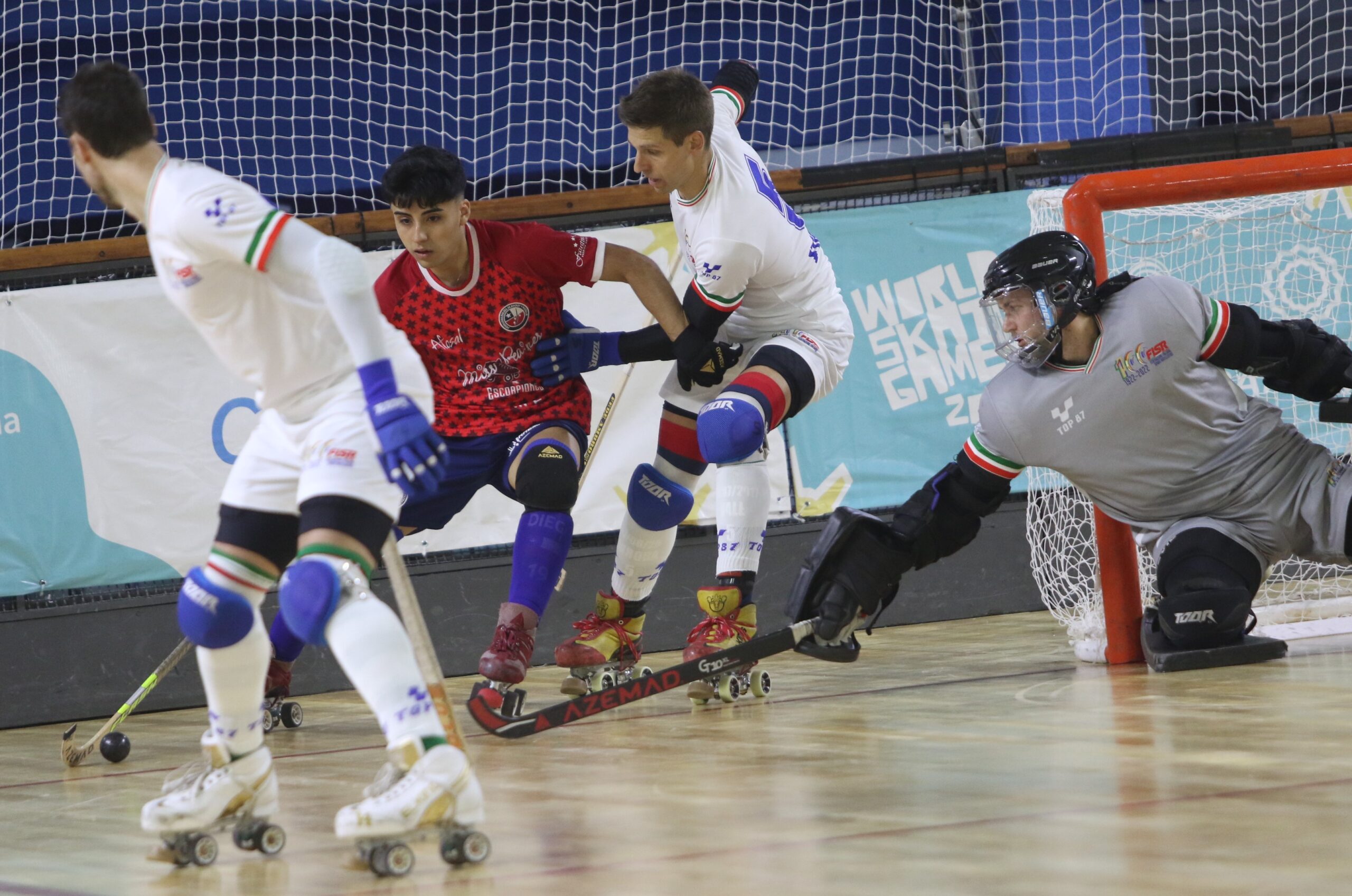 En el primer partido del Grupo A, Italia marcó la diferencia desde el principio en el 8-3 ante Italia. Dominando totalmente el juego, rápidamente consigue un penal al minuto y veintitrés segundos de juego sobre Alessandro Verona (N°9). Federico Ambrosio (N° 5) fue el ejecutor, que ante el disparo inicial, atajado por el portero trasandino, Diego García Valenzuela, aprovechó el rebote para elevar la bocha y colocarla en el ángulo izquierdo del guardameta, colocando el primer gol del partido.