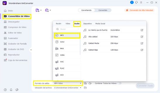 Wondershare UniConverter es un convertidor de video que permite transformar más de 1000 formatos de video en MP3. Aquí la lista de pasos a seguir para lograr ese objetivo: