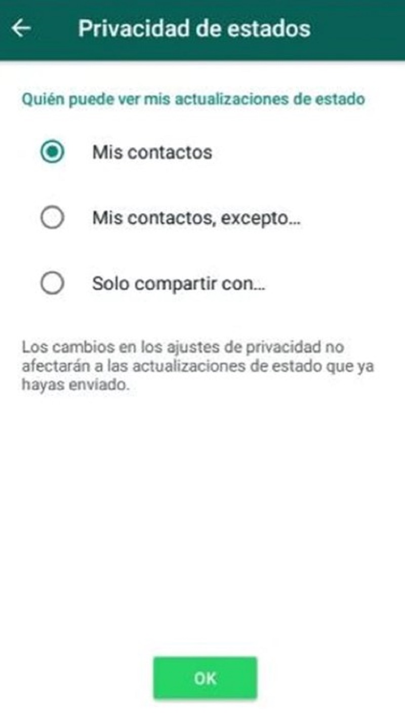 “Los cambios en los ajustes de privacidad no afectarán a las actualizaciones de estados que ya hayas enviado”, señala además WhatsApp como aclaración.