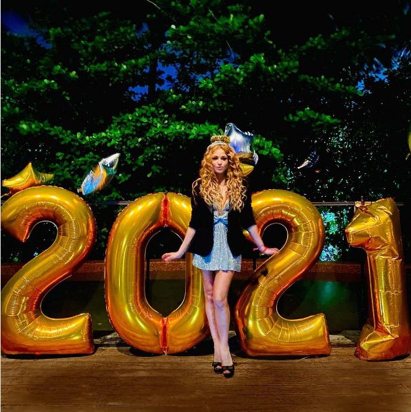Efusiva. Paulina Rubio posó con globos anunciando el 2021 y luego se la pudo ver junto a su hijo, entusiasmada, a la medianoche, dando la bienvenida al nuevo año a los gritos.