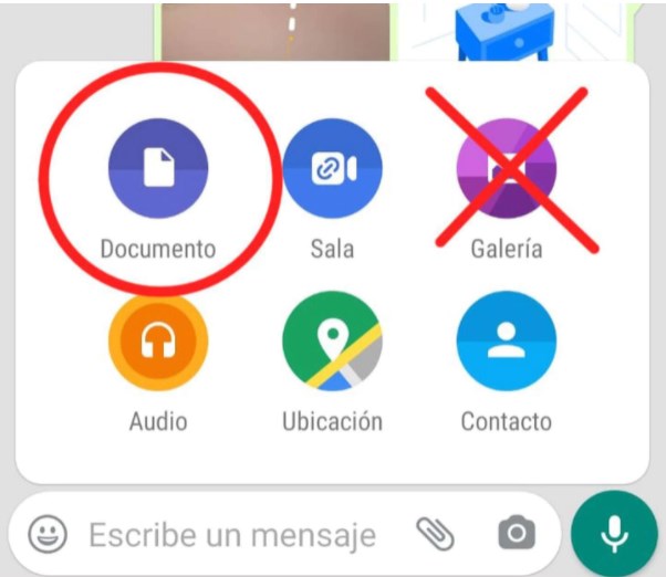 El primer paso es tocar el ícono del clip (el utilizado para adjuntar). Luego hay que seleccionar la opción “Documento”. Hay que recordar que al elegir “Galería” seleccionarás la foto o el video, y se perderá calidad en el camino.