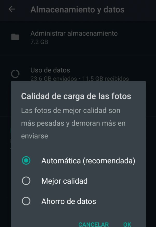 Una vez adentro veremos las alternativas, y la plataforma detalla que “las fotos de mejor calidad son más pesadas y demoran más en enviarse”. Las opciones son tres: automática -la recomendada, con compresión normal-, mejor calidad y ahorro de datos, la que las envía con menos resolución, se manda más rápido y gasta menos datos.
