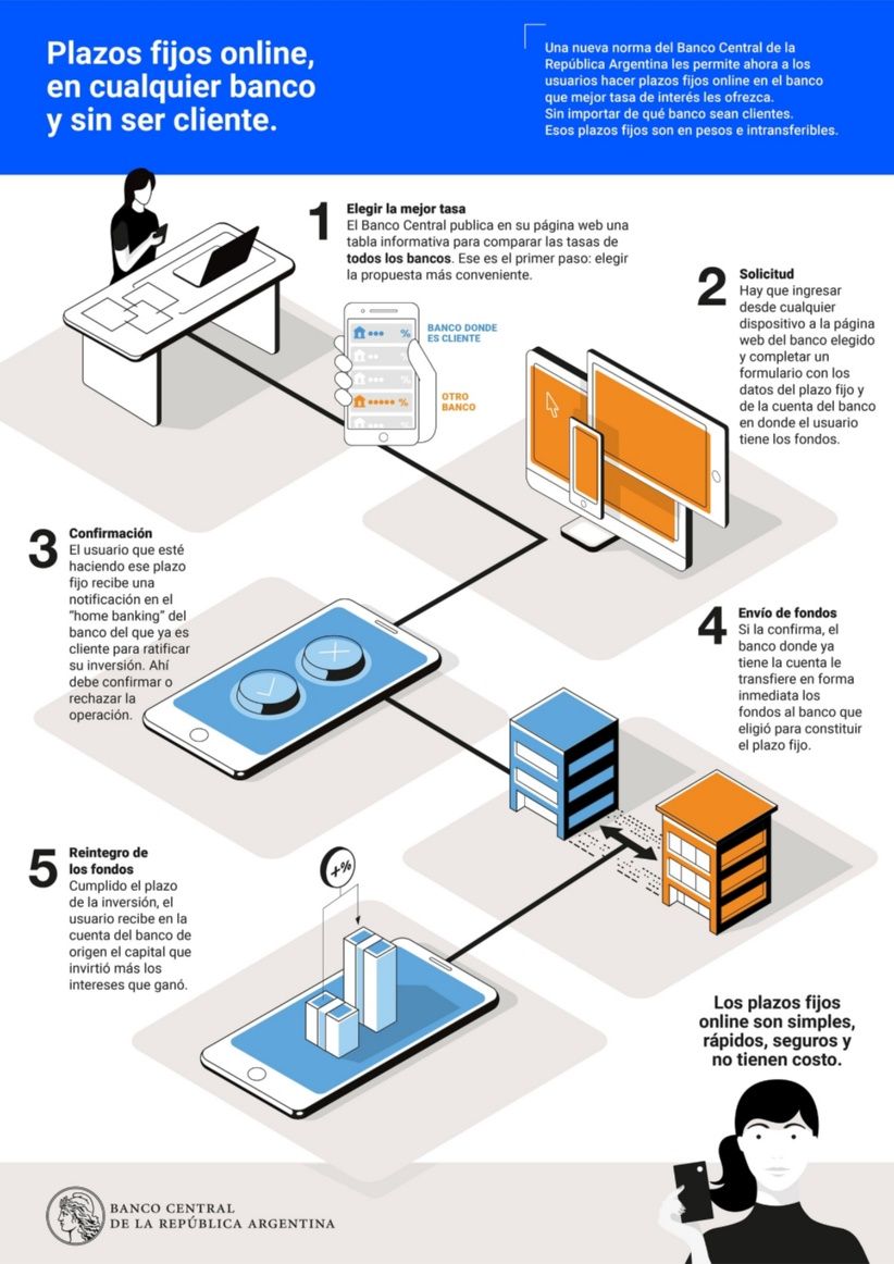 Esta herramienta busca facilitar a los usuarios la posibilidad de suscribir plazos fijos online en cualquier banco, con independencia de que sean clientes o no, de manera gratuita y sin requisitos administrativos previos.