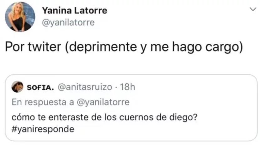 Si bien el drama quedó en el pasado, la panelista les permitió a sus seguidores que le hicieran preguntas a través del hashtag #yaniresponde. Una usuaria de Twitter, sin filtro, le consultó: "¿Cómo te enteraste de los cuernos de Diego?". Fiel a su estilo, lejos de darle la espalda a la pregunta, Yanina develó: "Por Twitter, fue deprimente y me hago cargo".