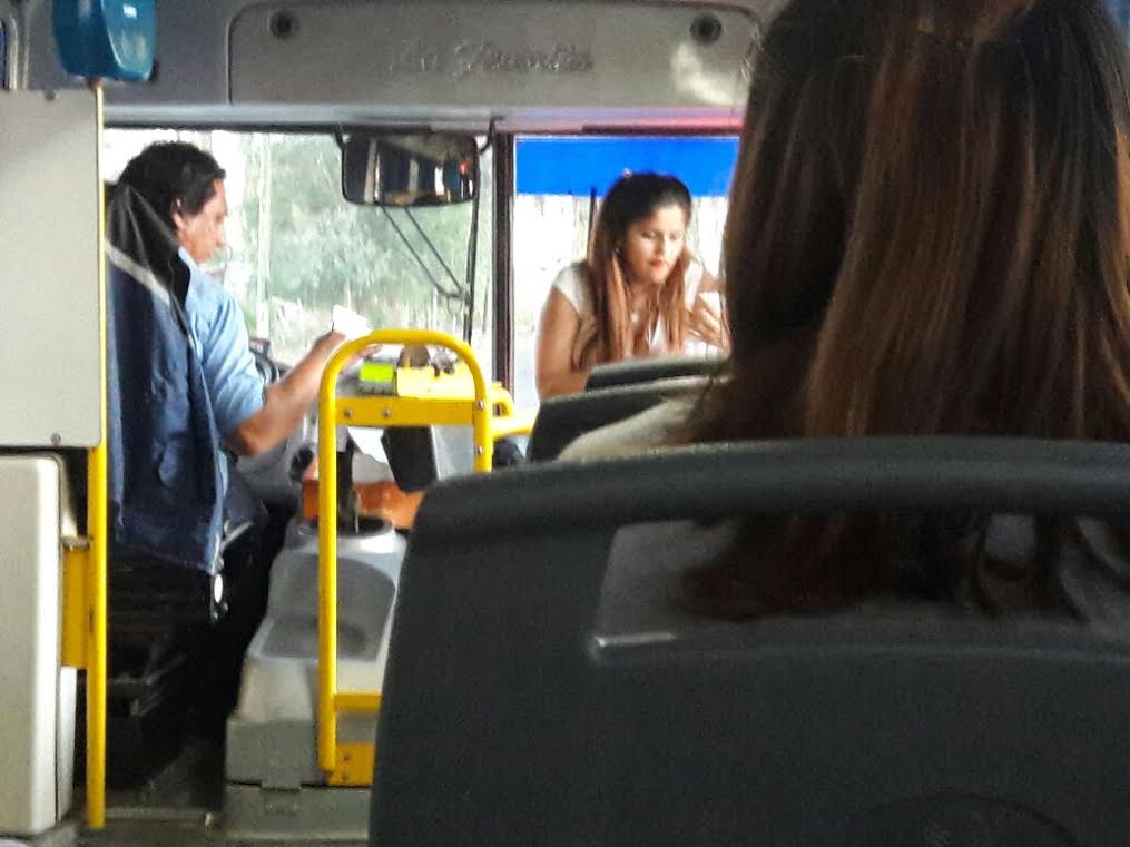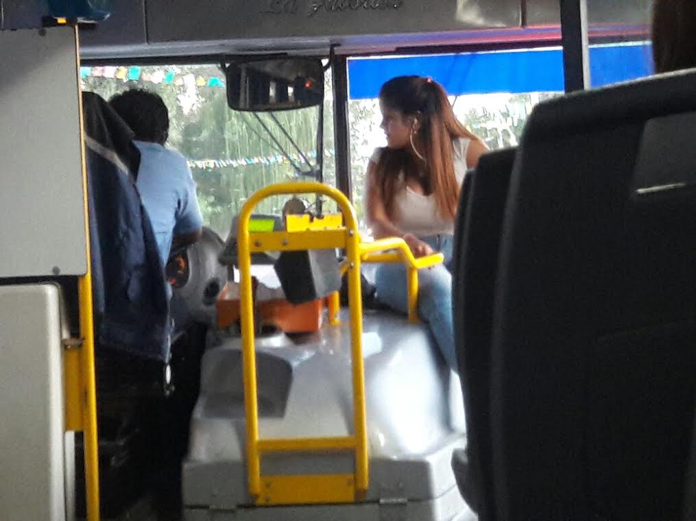 La imagen fue tomada en las últimas horas, en un colectivo de la empresa Albardón. Una joven subió al micro y se sentó al lado del chofer, al lado de la puerta.