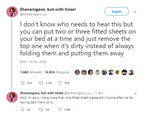 “No se quien necesita escuchar esto, pero se pueden poner dos o tres fundas de sábanas en el colchón, al mismo tiempo, y solo sacar la de arriba de todo cuando está sucia. En lugar de siempre tener que sacarlas y doblarlas”, fue el tuit que publicó, que generó repercusión entre los usuarios de la red social del pajarito azul. Gran parte de los mismos, tildaron a la usuaria (llamada @shenanigans_luv) de antihigiénica.
