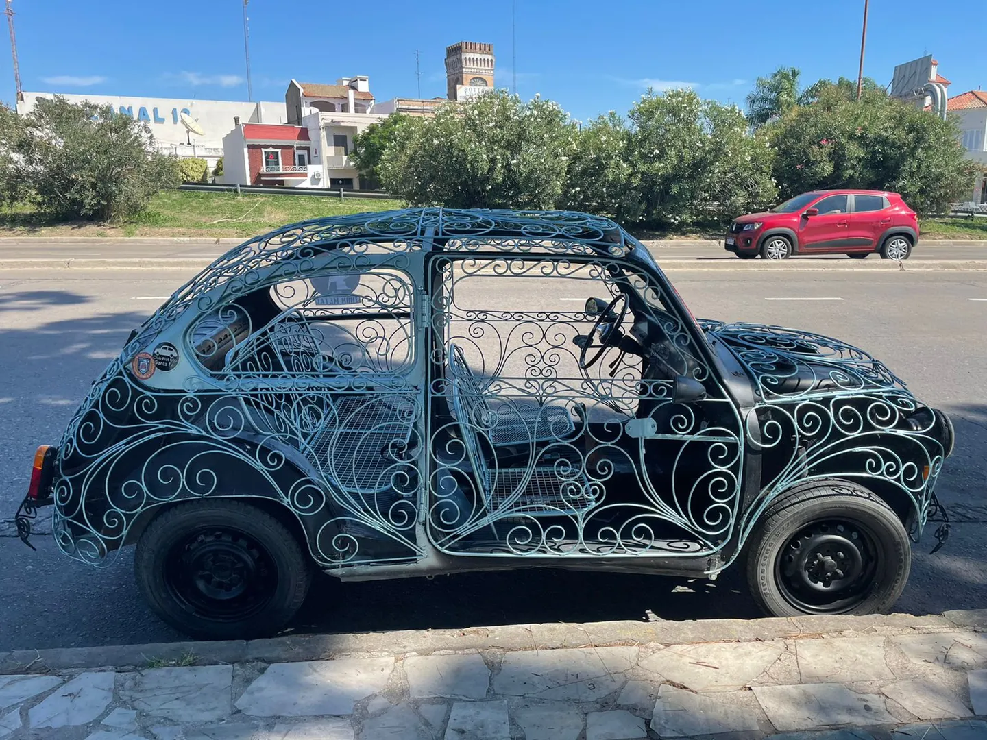 Una vez que aseguró el funcionamiento del vehículo, comenzó su trabajo y se encerró 12 días seguidos en su taller. “Fue un laburo intenso, de muchas horas”, recordó. Reemplazó todos los plásticos, por figuras hechas con hierros de 10, 8 y 6 milímetros. “Había visto por internet que en Estados Unidos habían hecho algo similar con un auto estilo Escarabajo y me inspiré en eso”, explicó.