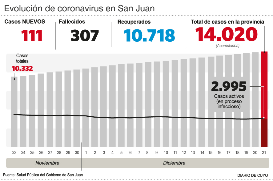 Cuando a fines de marzo surgió el primer positivo de coronavirus en San Juan lejos estaba imaginarse que hacia fines de año la provincia iba a superar los 14.000 contagios. Y sucedió ayer, luego de que el Ministerio de Salud Pública informó que fueron detectados 111 nuevas confirmaciones y de esta manera el acumulado llegó a 14.020. Por su parte, también fue reportada una nueva muerte por Covid.
