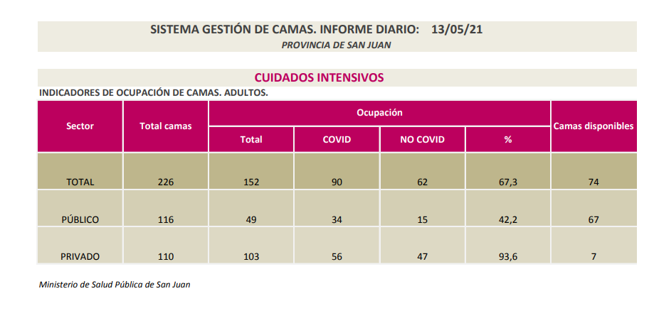 Se encuentran internados 208 pacientes en las áreas de COVID-19 (entre positivos y sospechosos) de los hospitales Dr. Guillermo Rawson; Dr. Marcial Quiroga; Dr. Ventura Lloveras, de Sarmiento; Dr. César Aguilar, de Caucete; Dr. José Giordano, de Albardón; Dr. Federico Cantoni, de Pocito; CEMEC; Dra. Julieta Lanteri; Hospital San Roque, de Jáchal; Hospital Dr. Alejandro Albarracín, de Valle Fértil; Hospital de Barreal, de Calingasta; Hospital Privado; Instituto Médico; Clínica El Castaño; Clínica Santa Clara; Sanatorio San Juan y CCI.