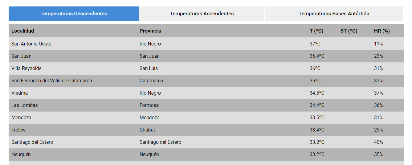 En plena siesta sanjuanina, la provincia volvió a formar parte del ranking de los lugares más calientes del país. San Juan marcó 36,4°C, a las 16, y se ubicó detrás de San Antonio Oeste, Río Negro, que trepó hasta los 37°C. Además, Villa Reynolds de San Luis completó el podio con 36°C.