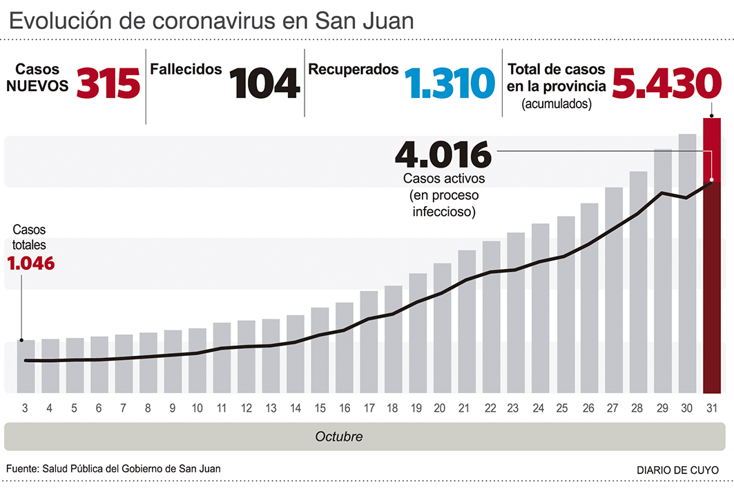 Octubre tuvo siete veces más personas con coronavirus que todo septiembre, el más adverso que ostentaba San Juan y que mostraba las secuelas del brote inicial en Caucete. Sin embargo, con circulación viral comunitaria confirmada precisamente el mes pasado y una curva de contagios que sigue en franco ascenso, es incierto que vaya a ser el peor mes mirando la proyección.