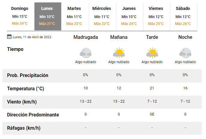 Cielo despejado a parcialmente nublado y viento del sur, rotando al sudeste.