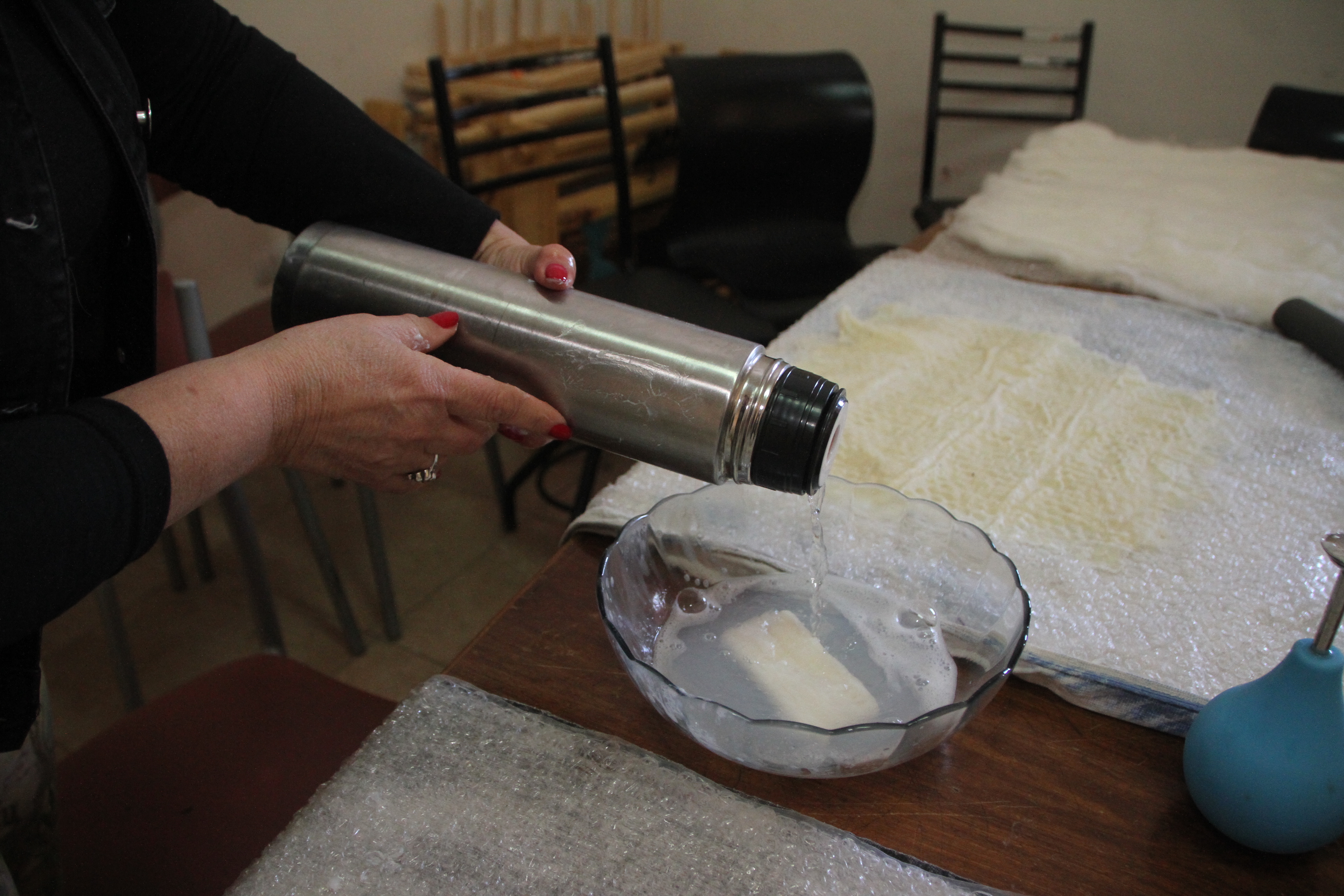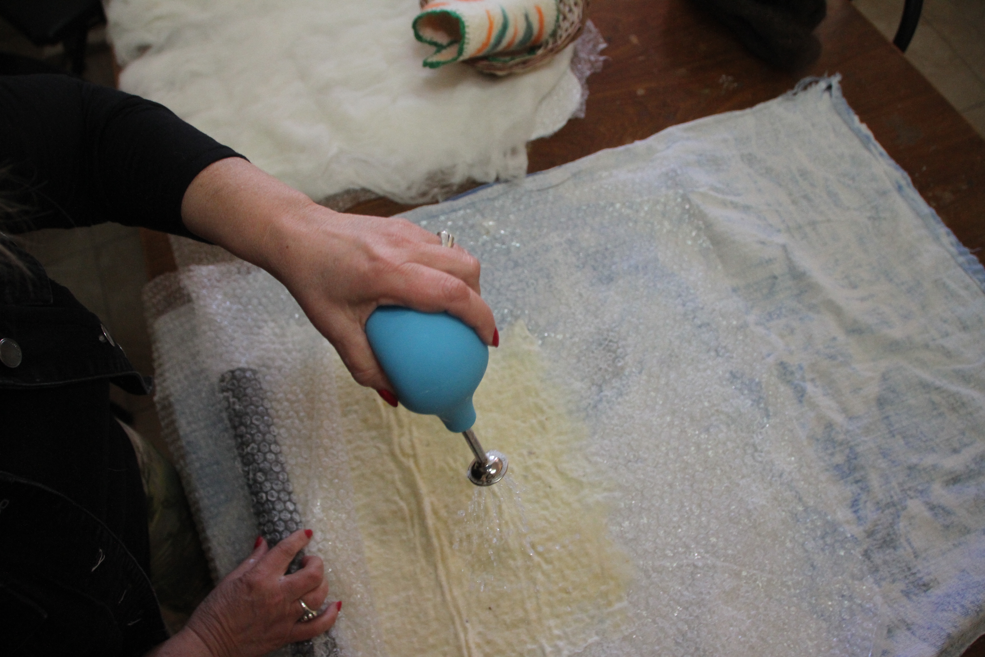 Con el agua jabonosa que se preparó, se humedece el material que se está trabajando. En la foto la artesana usa un rociador perita comprado por Internet. Si no, una botella con la tapa perforada.
