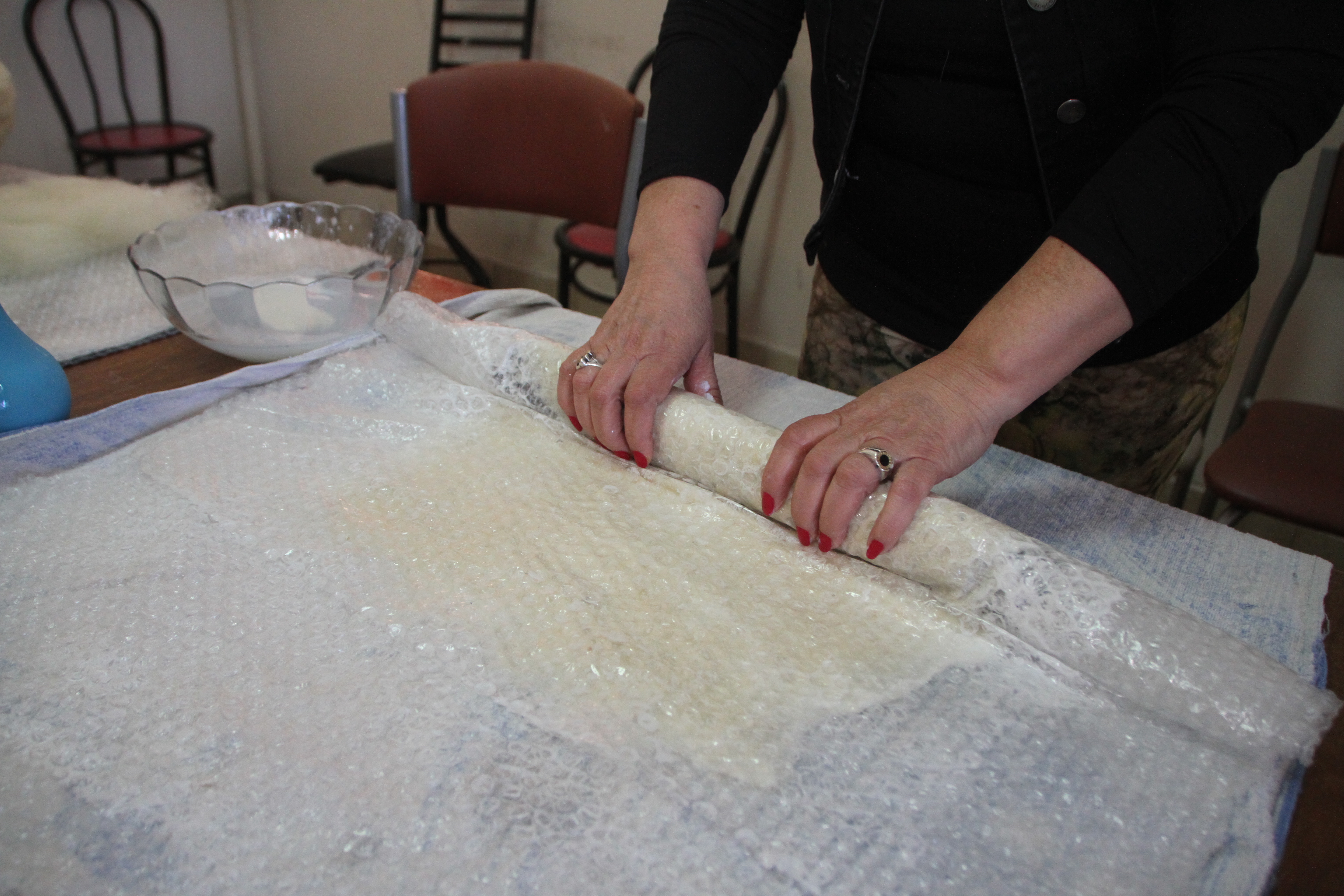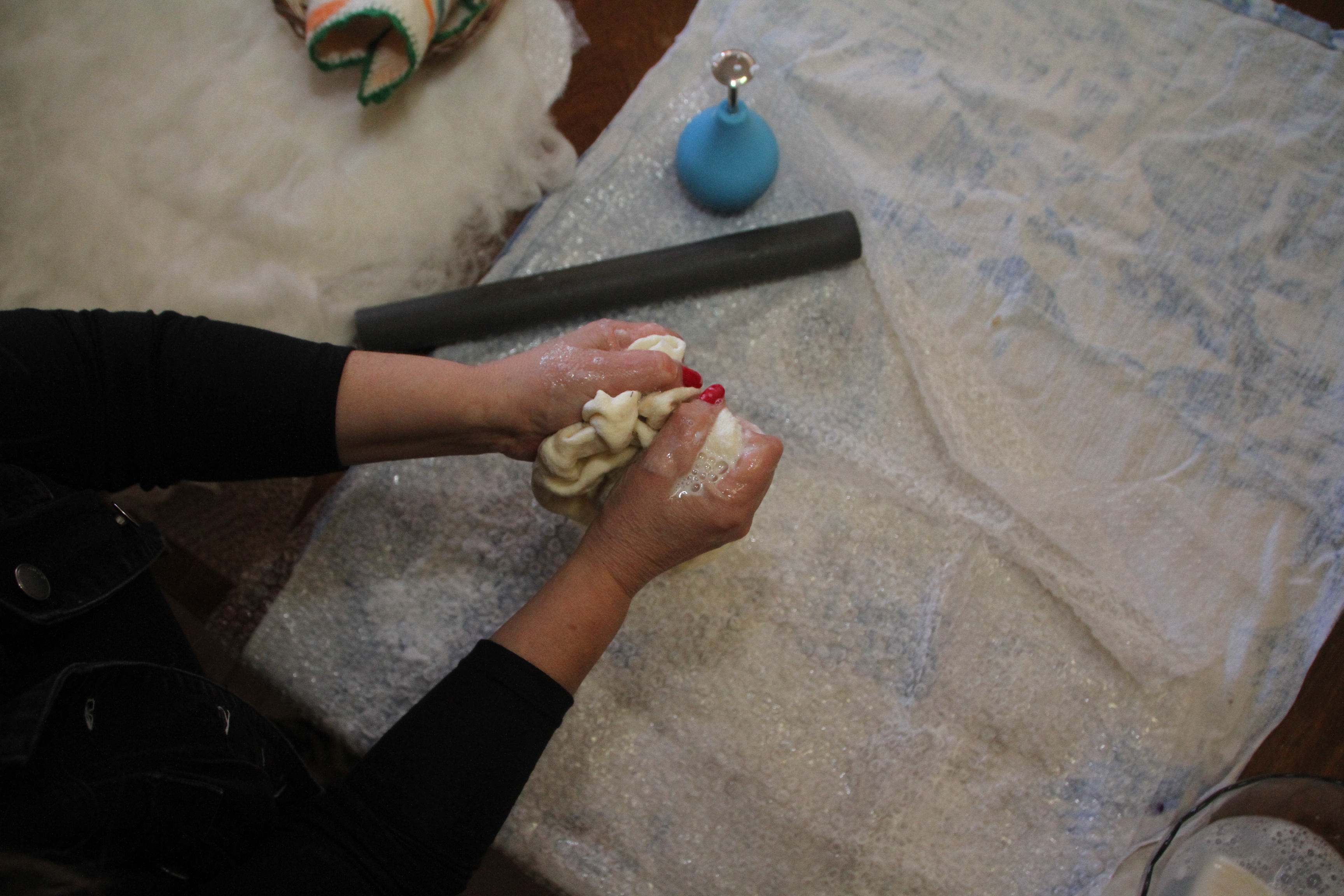 Comienza el amasado para unir las fibras, para transformarlo en tejido. Se usa un bolillo liviano, se lo pasa en todas las direcciones; también enrollando el paño y presionando.