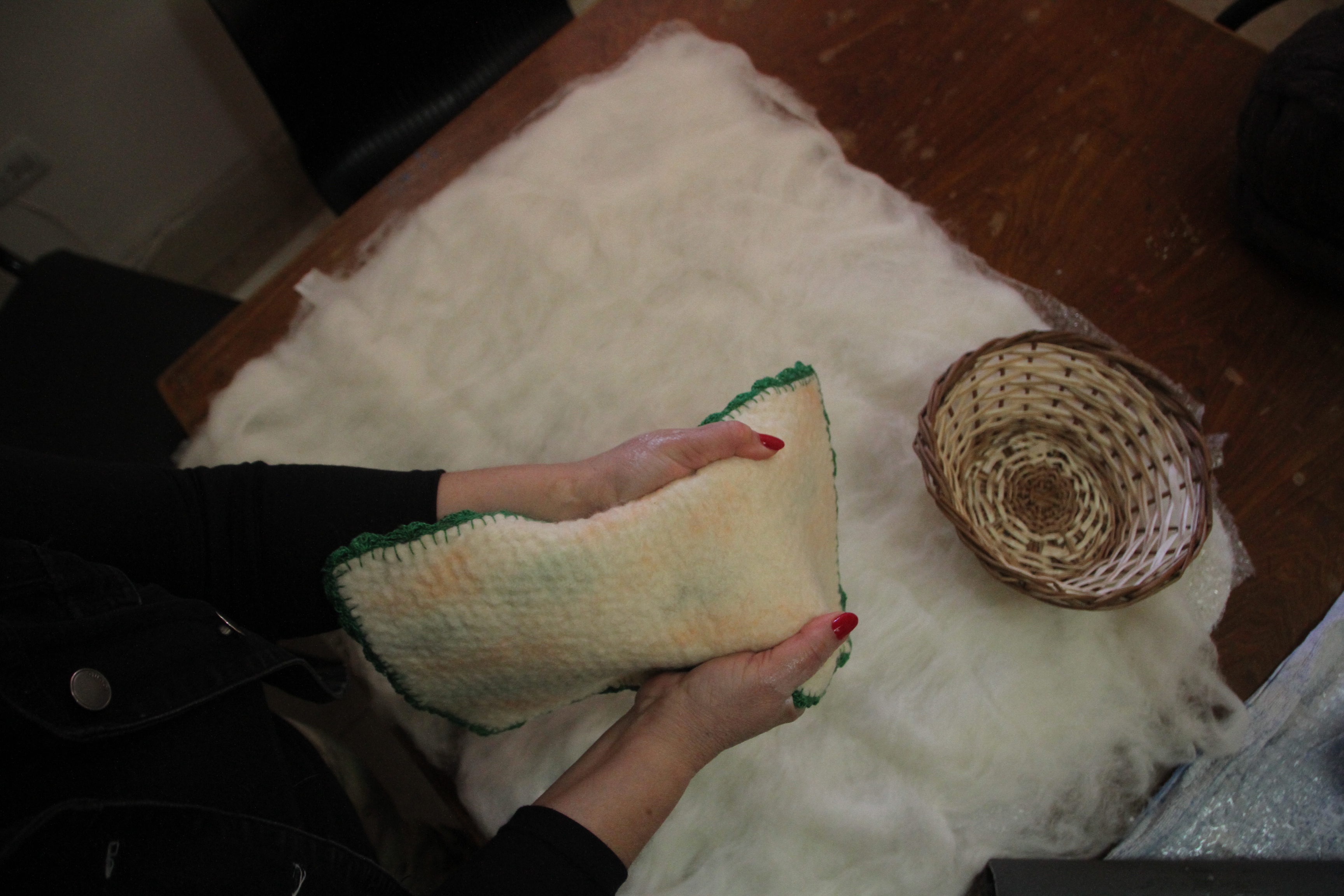 Tela en la última etapa. Sobre la mesa, el paño que se dejó en suspenso, se moja y se sigue trabajando. Una vez lista la trama, se enjuaga y deja secar. La artesana sostiene el fieltro terminado.