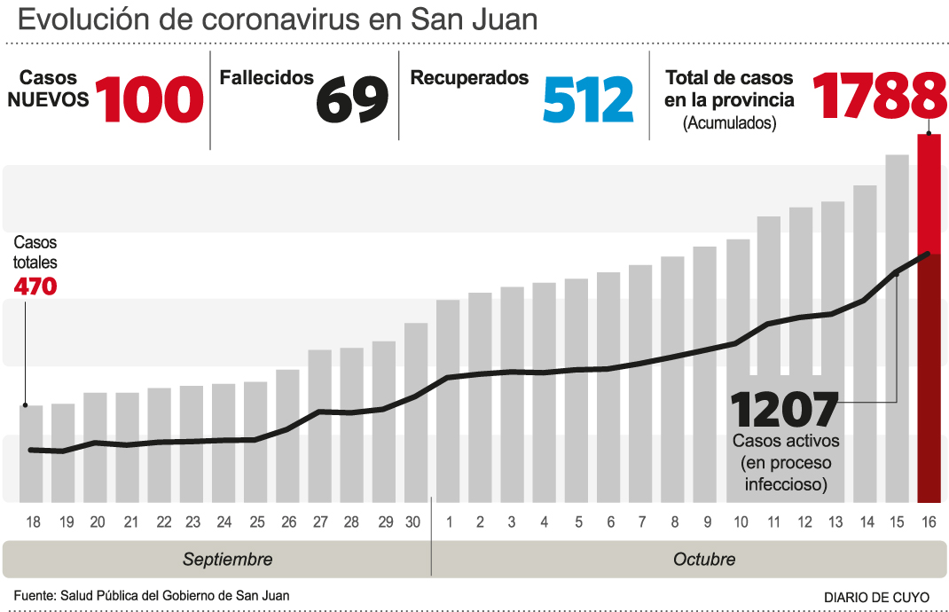 Los últimos días mostraron números altos de contagios, incluso con récord de casos detectados en 24 horas, que le dieron altura a la curva. San Juan ayer superó el millar de personas con infecciones en curso, es decir, que tienen el virus activo. Sin embargo, la contraparte es menos adversa puesto que de acuerdo a las estadísticas oficiales los internados no llegan al 10% de aquel total. Por otro lado, ayer hubo 100 nuevos positivos, por lo que el total de casos ahora es de 1.788.