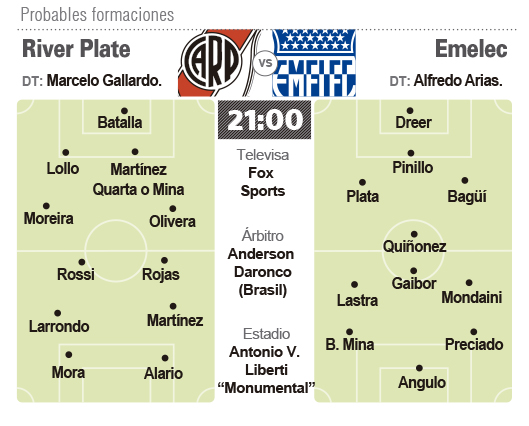 River recibirá hoy a Emelec de Guayaquil con un equipo alternativo, preservando a algunos titulares para el superclásico, y con un empate quedará clasificado a los octavos de final de la Copa Conmebol Libertadores. El juego en el estadio Monumental, correspondiente a la tercera fecha del Grupo 3 de la cuarta fase, dará comienzo a las 21, con arbitraje del brasileño Daronco y será televisado por Fox Sports.