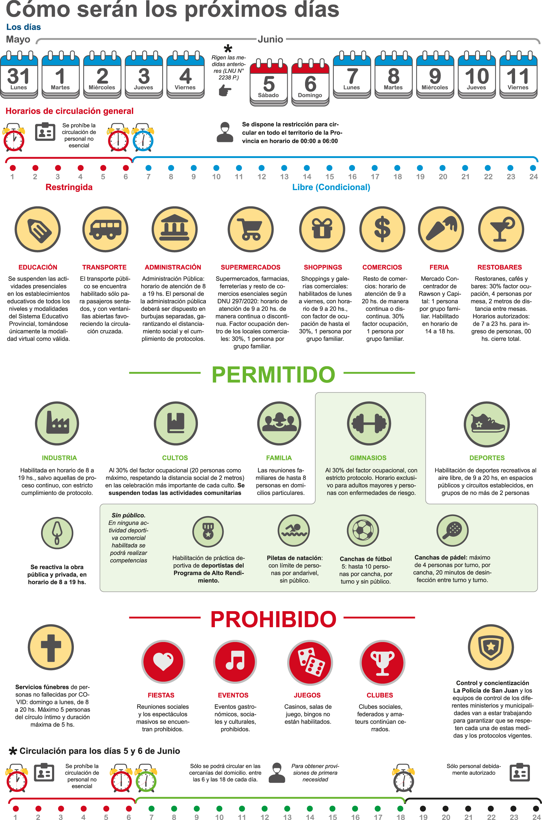 "Prevenir el aumento de contagios de coronavirus", la clave que dio a conocer el Gobierno de San Juan al anunciar las nuevas medidas contra el covid-19 y que regirán desde este lunes y hasta el 11 de junio. Se trata de un regreso a la mayoría de las actividades que se desarrollaban antes del actual confinamiento estricto, pero con nuevos límites y fundamentalmente sin alumnos y docentes en las escuelas, puesto que no habrá clases presenciales. A su vez, en estas próximas dos semanas habrá un paréntesis con restricción total entre el 5 y 6 de junio, a tono con lo que ya había anunciado Nación (ver página 3). Las medidas fueron comunicadas ayer en la tarde, luego de una reunión de gabinete en Casa de Gobierno y en la que fue analizado el contexto sanitario, explicó el gobernador Sergio Uñac en sus redes sociales.
