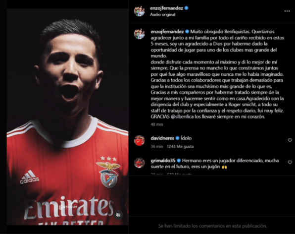 Mientras viajaba a Londres para ser presentado en su nuevo equipo, Enzo hizo un posteo de despedida para la gente de Benfica, con un palito bien direccionado: "Que la prensa no manche lo que construimos juntos porque fue algo maravilloso que nunca me había imaginado". Contundente.