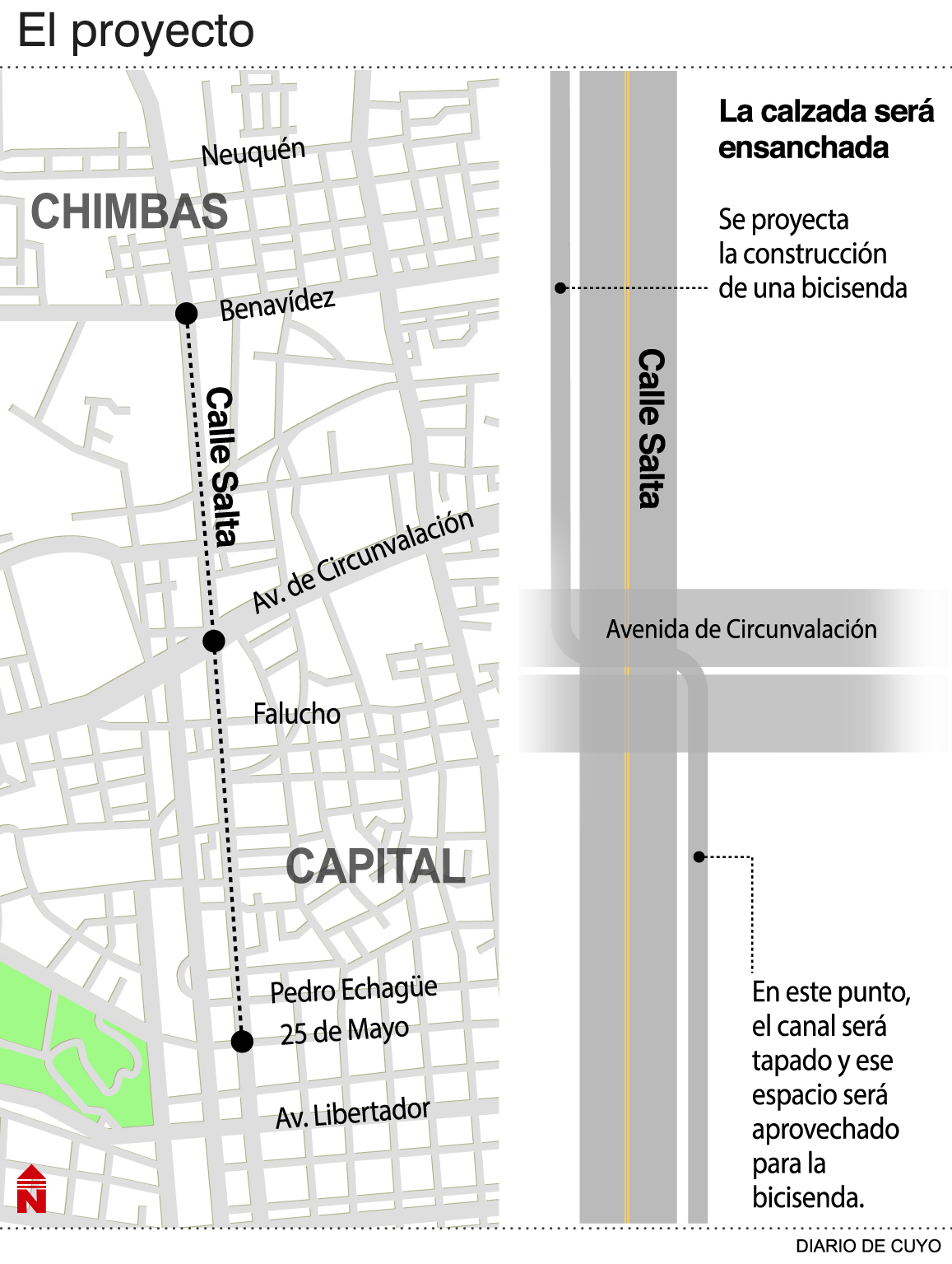Actualmente esa arteria tiene un tramo donde el pavimento está muy deformado por lo que desde la municipalidad ya tenían pensado repavimentarla. Ahora el Ejecutivo decidió tomar la posta y llevar adelante un proyecto más integral para ensanchar la calle hasta el límite con Chimbas, con el agregado de sumar iluminaria y hasta una ciclovía. Desde hace casi un año que desde la gestión de Franco Aranda pretenden dar una solución al pavimento de calle Salta, sobre todo en la intersección Maipú hasta calle Paraguay, donde la calzada ha quedado muy deteriorada por el alto tránsito. Capital tiene jurisdicción sobre la calle hasta el cruce con avenida de Circunvalación, y es por eso que la repavimentación planteada por el municipio sólo abarcaba hasta ese lugar. A principio de año, cuando desde el Ejecutivo tomaron noticia de que en el mes de febrero Aranda iba a encarar la obra, decidieron levantar el teléfono y pedirle que frene los trabajos con la intención de llevar adelante un proyecto más integrador y superador. Ahora planean hacer una calle más ancha, con mejor iluminación y hasta que pueda contener una vía exclusiva para los ciclistas, pero no solo hasta Circunvalación sino que llegará hasta calle Benavídez, donde el tramo ya pertenece a Vialidad Provincial. (Ver infografía)