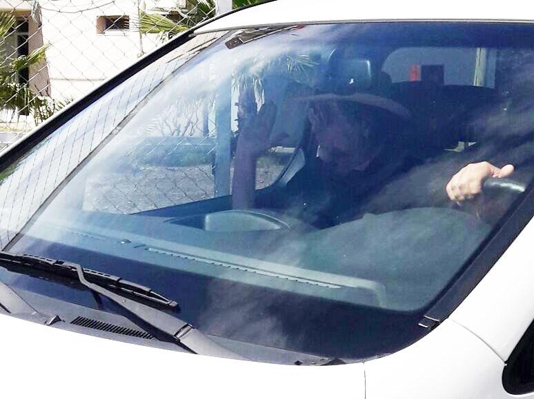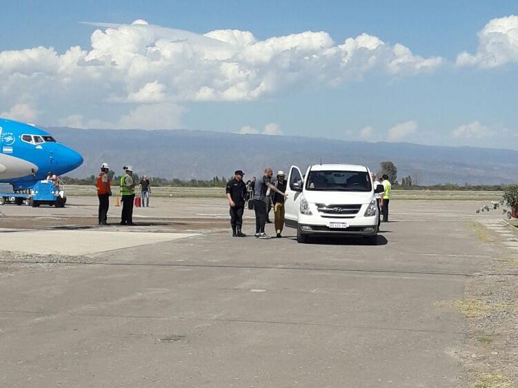 Durante la siesta, el cantautor llegó al aeropuerto Domingo Faustino Sarmiento, ubicado en Las Chacritas, con un sol a pleno que lo recibió.