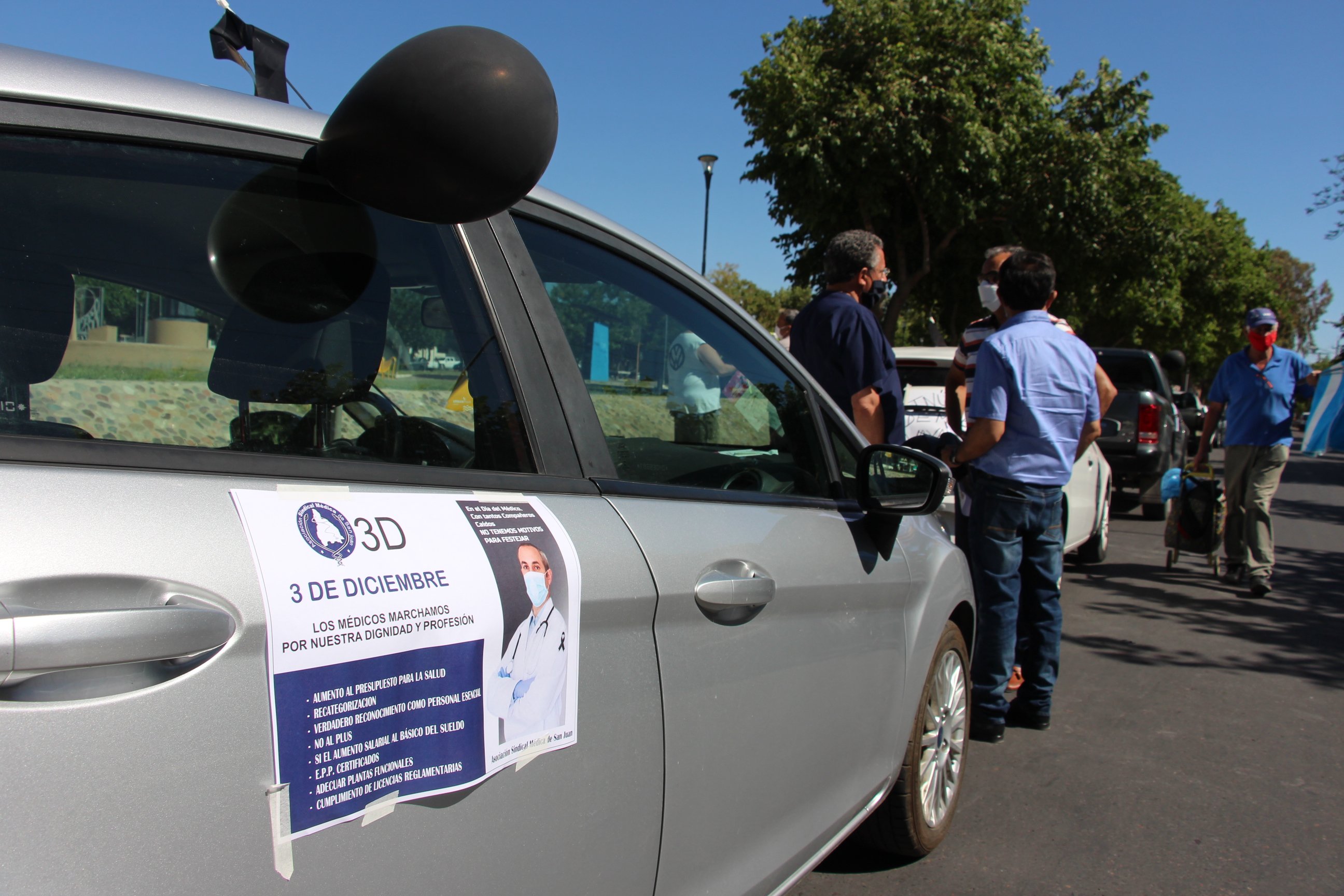 La concentración fue alrededor de las 10 en calle Pueyrredón, entre General Paz y Santa Fe. De ahí se movilizaron al Hospital Rawson, para luego encarar por calle Santa Fe una larga caravana que se detuvo frente a Trabajo, donde expresaron su malestar.
