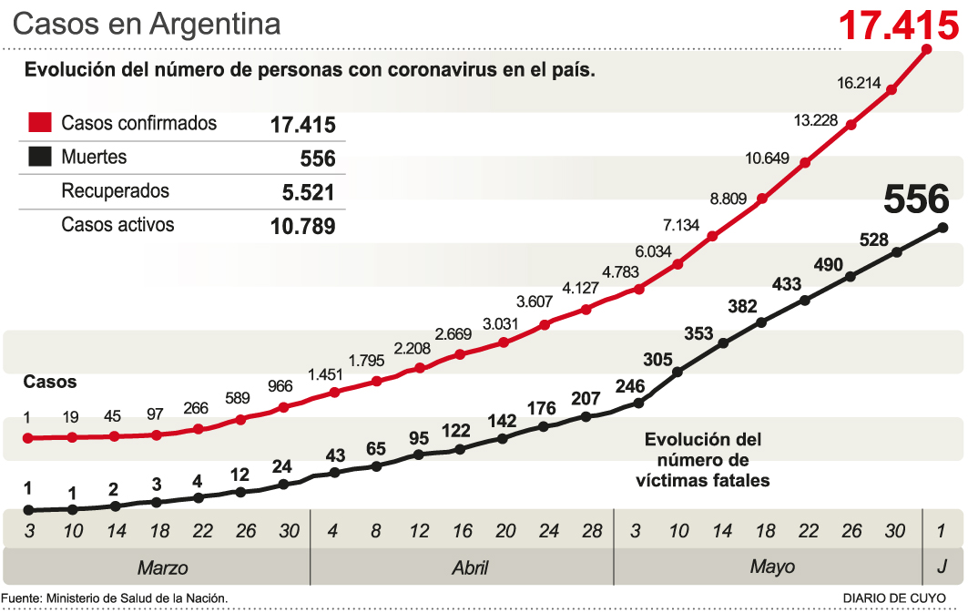 Un total de 17 personas murieron y 564 fueron diagnosticadas con coronavirus en las últimas 24 horas en Argentina, con lo que suman 556 las víctimas fatales y 17.415 los infectados desde el inicio de la pandemia, informó el Ministerio de Salud de la Nación.