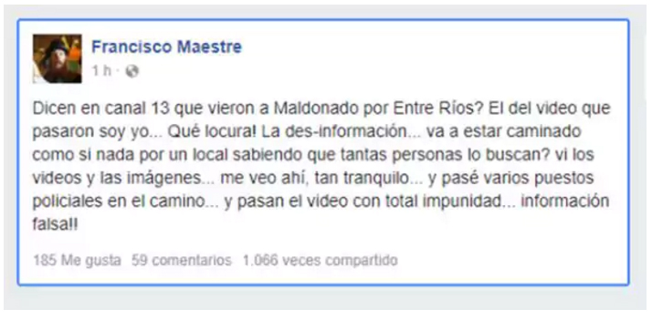 El hermano de Maldonado, en tanto, expresó en declaraciones radiales que al joven "lo están buscando como persona extraviada y nosotros hablamos de desaparición forzada de persona, no es una persona extraviada".