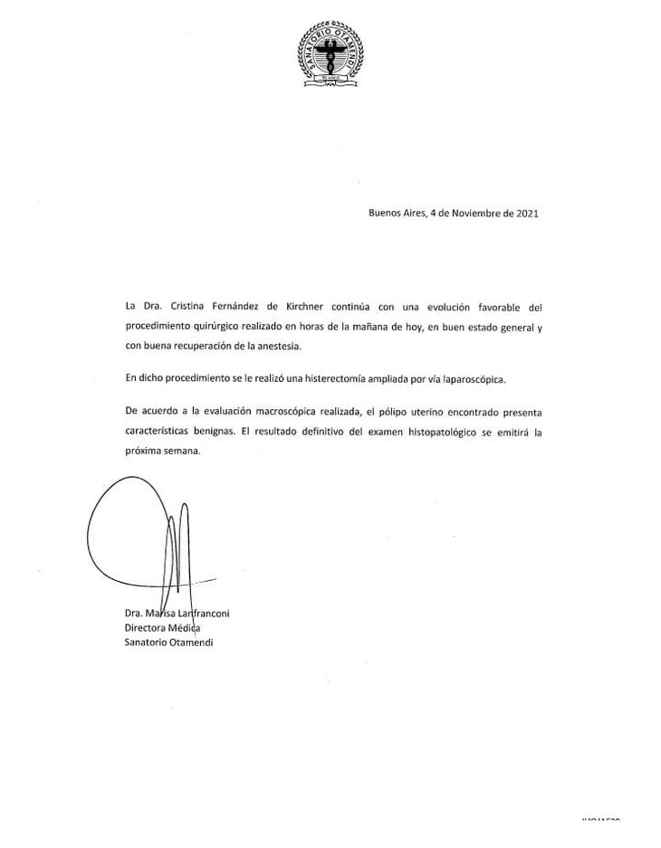 "La Dra. Cristina Fernández de Kirchner continúa con una evolución favorable del procedimiento quirúrgico realizado en horas de la mañana de hoy, en buen estado general y con buena recuperación de la anestesia", sostiene el texto firmado por la directora médica de la institución, Marisa Lanfranconi.