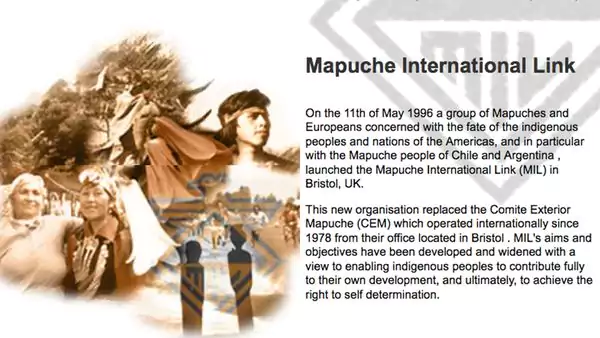 "El día 11 de mayo de 1996, un grupo de mapuches y europeos comprometidos con el destino de los pueblos y naciones indígenas de las Américas, y en particular con el pueblo mapuche de Chile y Argentina, lanzaron la Mapuche International Link (MIL) en Bristol, United Kingdom", explican las autoridades de esta organización; a saber, Edward James (Relaciones Públicas), Colette Linehan (administradora), Madeline Stanley (coordinadora de Voluntarios), Fiona Waters (a cargo del equipo de Derechos Humanos), entre otros.